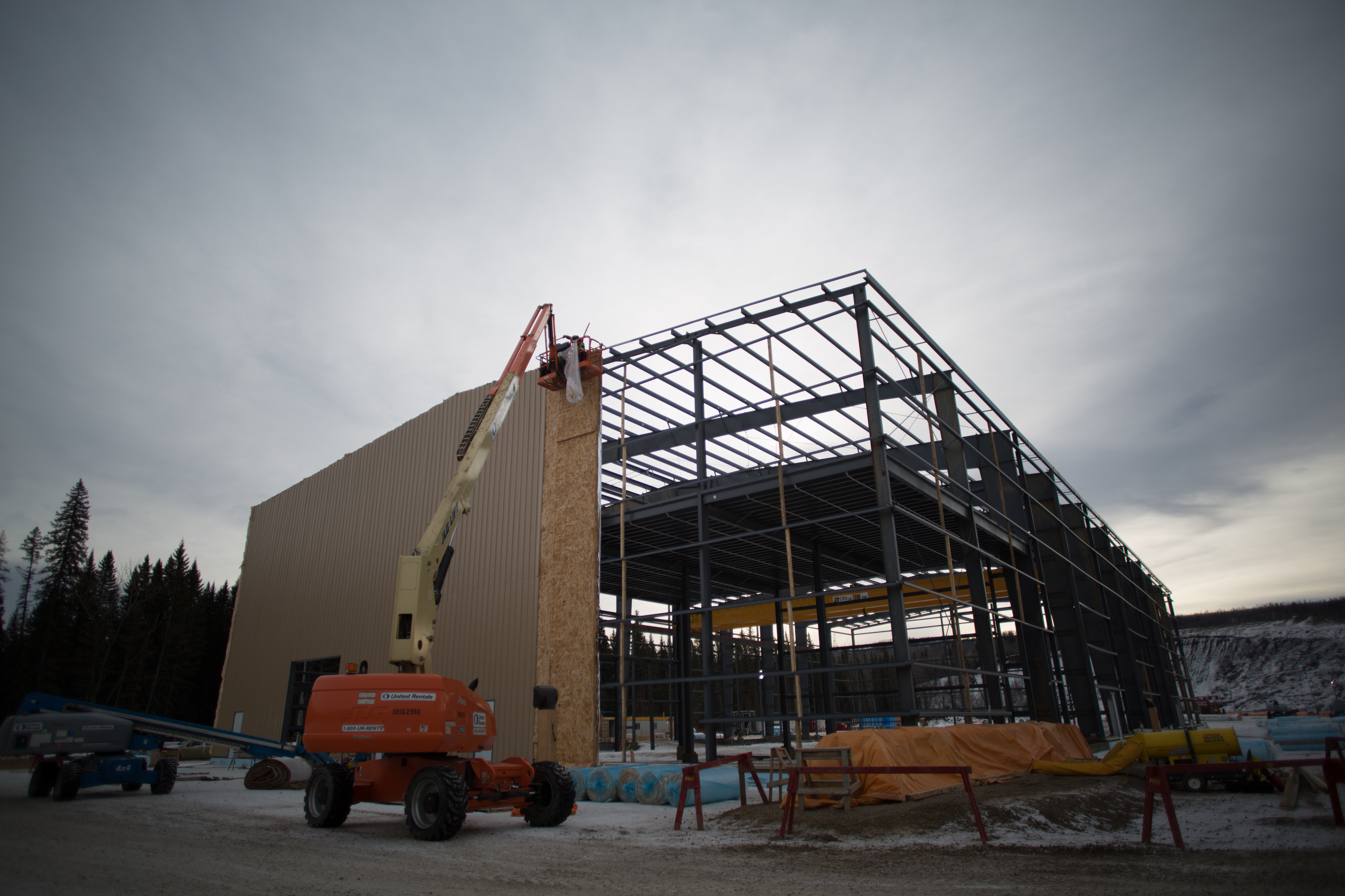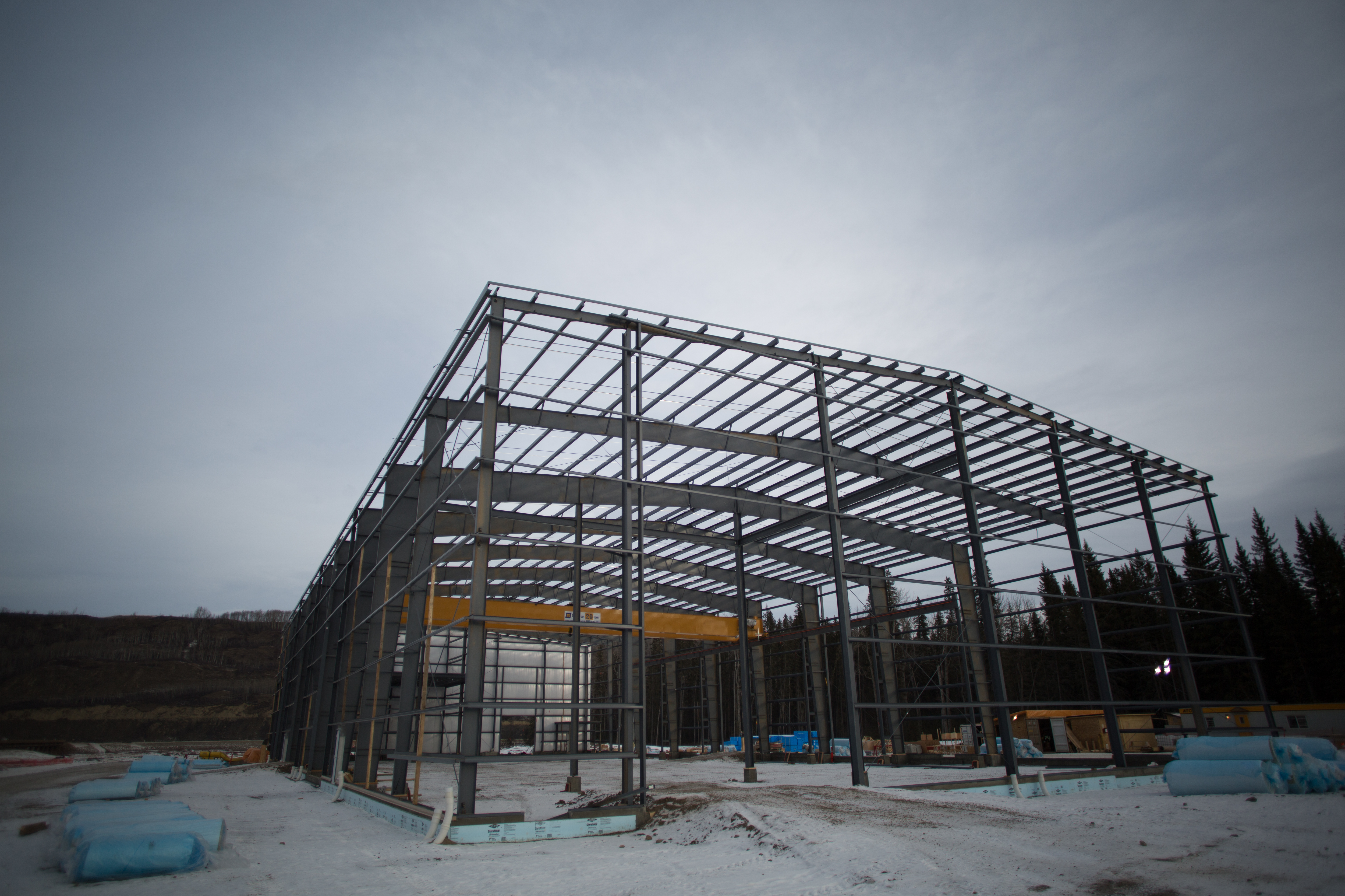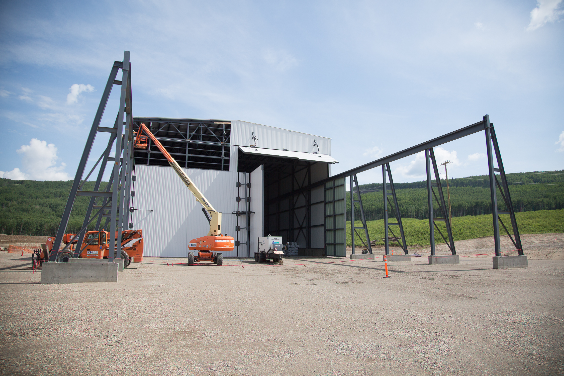 Exterior view of the temporary on-site manufacturing facility for the turbines and generators. (June 2017)