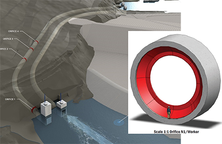 Prior to filling the reservoir, we installed four large rings in one of the diversion tunnels to restrict the flow of water.